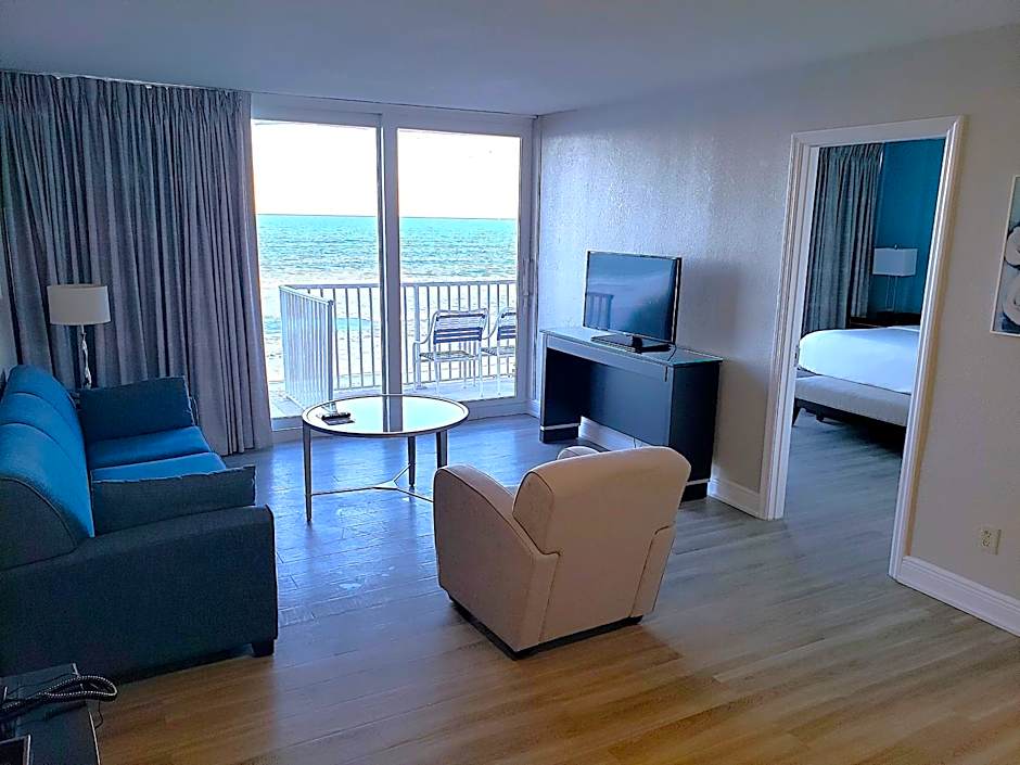 This oceanfront suite has a balcony, seating area and a small refrigerator.