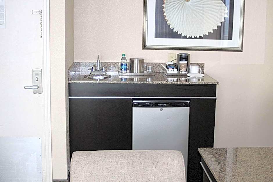 This suite has a flat-screen TV, small refrigerator and seating area.